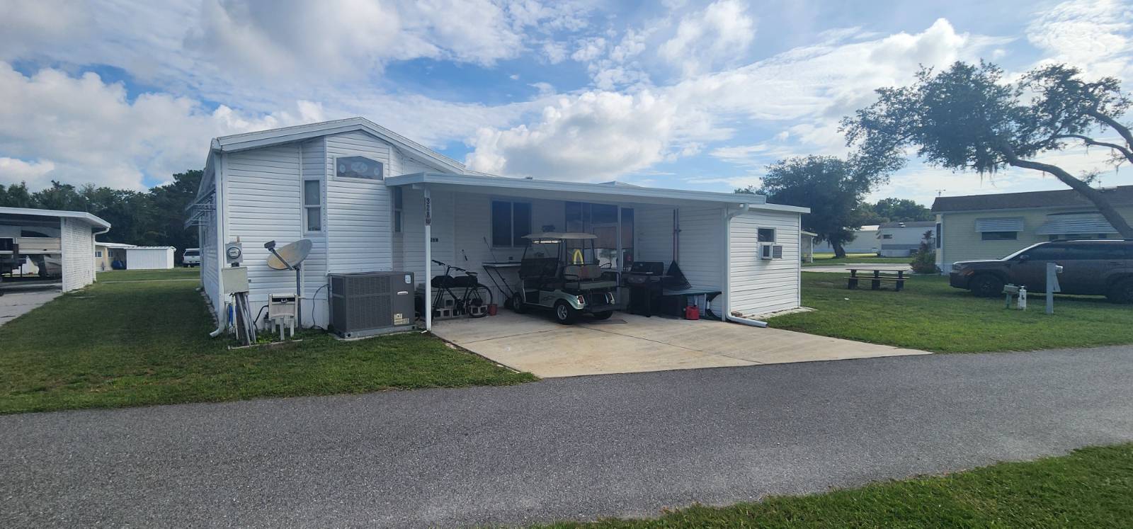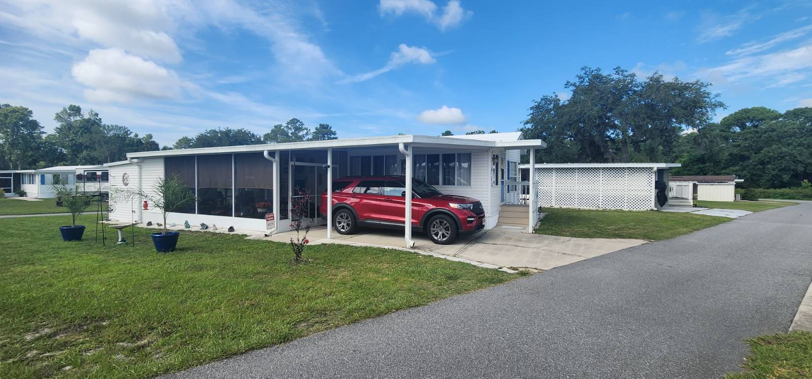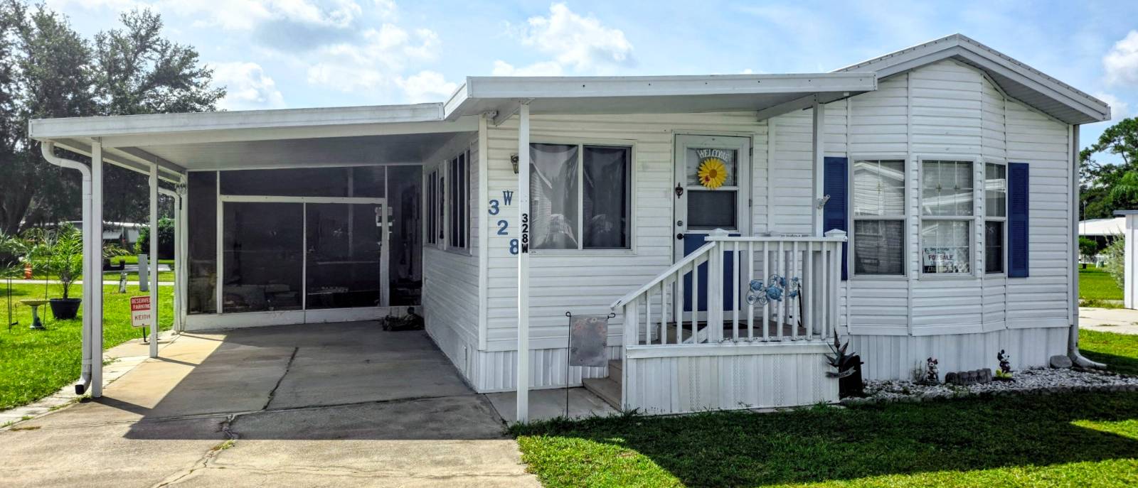 COMMUNITY: Welcome to Holiday RV Village a sought after fun in the sun resort community. 55 plus gated community sitting on 200 acres, complete with 2 pools, private Marina with Chain of Lakes access, planned activities, onsite cafe, pet friendly 2 dog max and a ton of Resort style amenities. Close to Disney, local springs, beaches and many other local attractions. FEATURES: Upgraded LVT flooring, 2021 Central Air unit, New roof 2024, and updated bathroom with step in shower. 14 wide, 11x36 one level addition, 886 square feet. 11x14 bedroom which fits a King, new refrigerator, screen room with double door, 2 carport areas. BENEFITS: Desired WEST 3 side, recent 4 point inspection, newer roof and central ac. Rare find with 14 wide roomy and spacious, coming mostly furnished for an easy move! Indoor laundry and potential area for second bedroom! Lifestyle fee includes water, sewer and trash and is below local average!!!