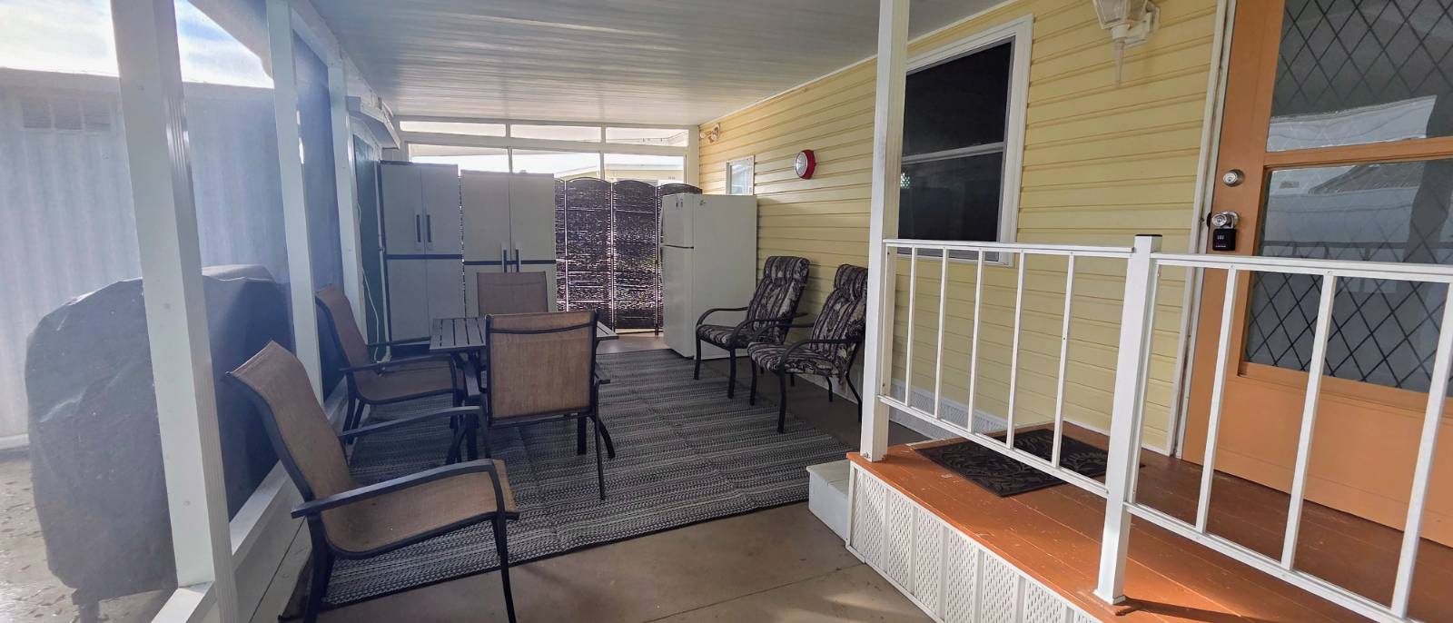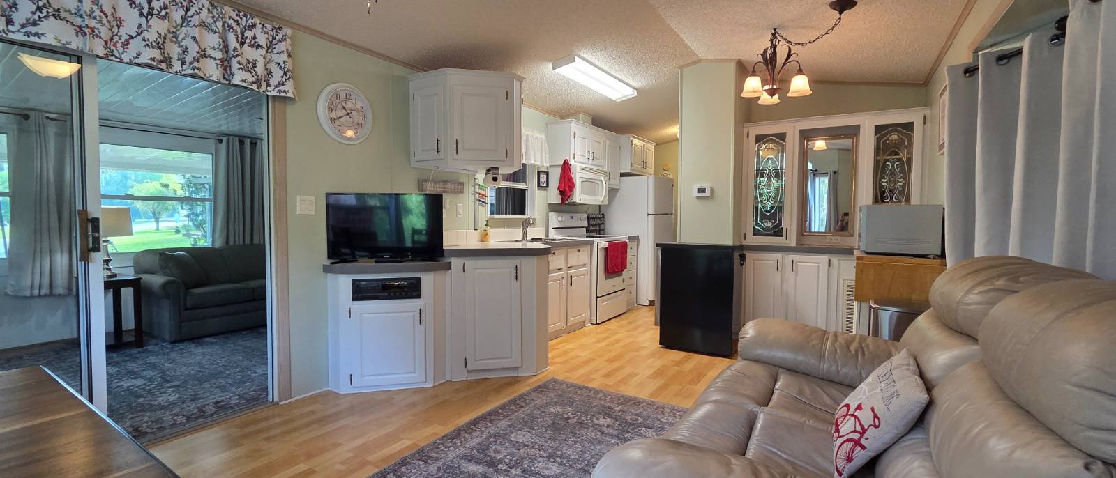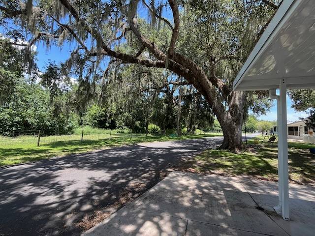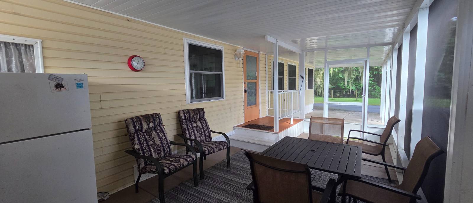 COMMUNITY: Welcome to Holiday RV Village a sought after fun in the sun resort community. 55 plus gated community sitting on 200 acres, complete with 2 pools, private Marina with Chain of Lakes access, planned activities, onsite cafe, pet friendly 2 dog max and a ton of Resort style amenities. Close to Disney, local springs, beaches and many other local attractions. FEATURES: BRAND NEW ROOF over the ENTIRE HOME in 2025! 11x20 carport plus parking in the back, 11x23 screen room with a tri-door, LARGE one level addition, Laundry is indoors in its own separate room. Estimated 914 square feet with potential for second bedroom. Central heat and air 2019. BENEFITS: Desired WEST 3 side on the outer circle, quiet serene setting with a view of untouched Florida across the street. Coming furnished for an easy move! Well maintained by current owners! Lifestyle fee includes water, sewer and trash and is below local average!!!