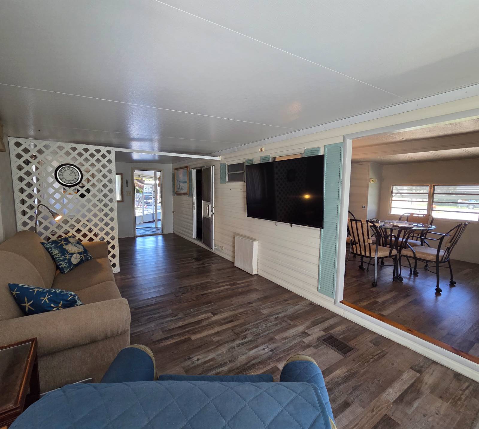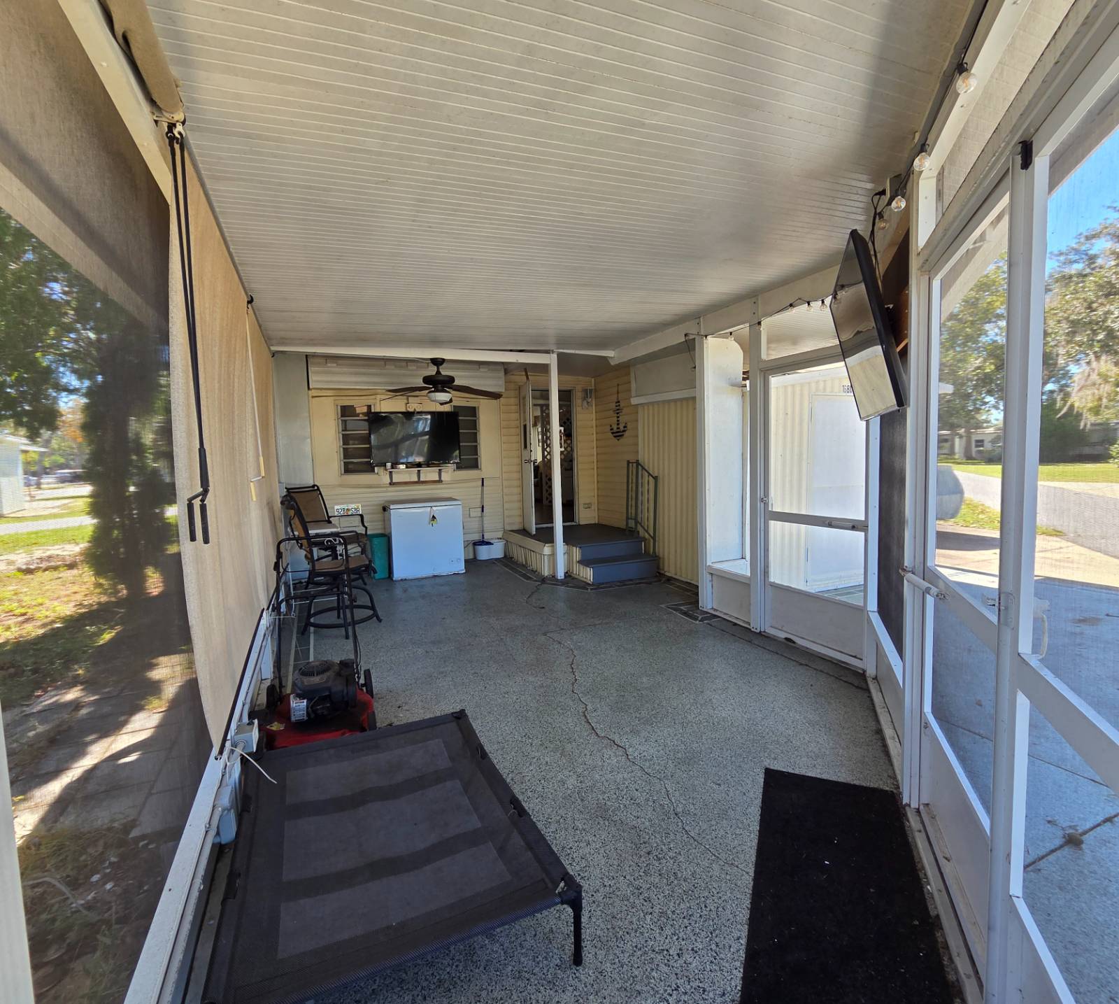 COMMUNITY: Welcome to Holiday RV Village a sought after fun in the sun resort community. 55 plus gated community sitting on 200 acres, complete with 2 pools, private Marina with Chain of Lakes access, planned activities, onsite cafe, pet friendly 2 dog max and a ton of Resort style amenities. Close to Disney, local springs, beaches and many other local attractions. FEATURES: Home offers a one level, open concept 10x29 addition, 710 square feet, upgraded kitchen, upgraded flooring, step in shower, 12x22 screen room with double door. BENEFITS: Walking distance to all amenities, potential for second bedroom, easy entry, nice parking. Easy entry shower. Coming furnished for easy move! Lifestyle fee includes water, sewer and trash and is below local average!!!
